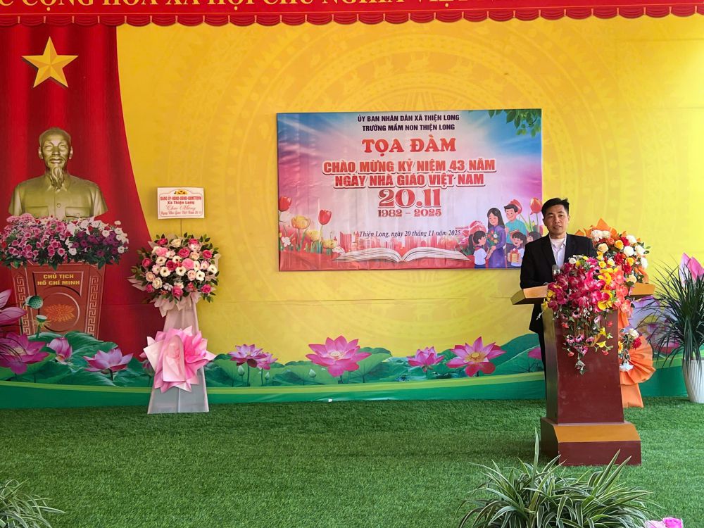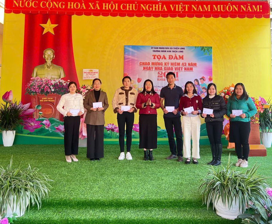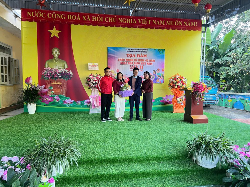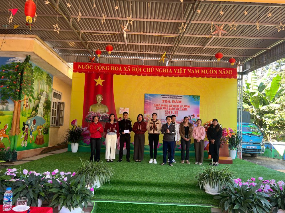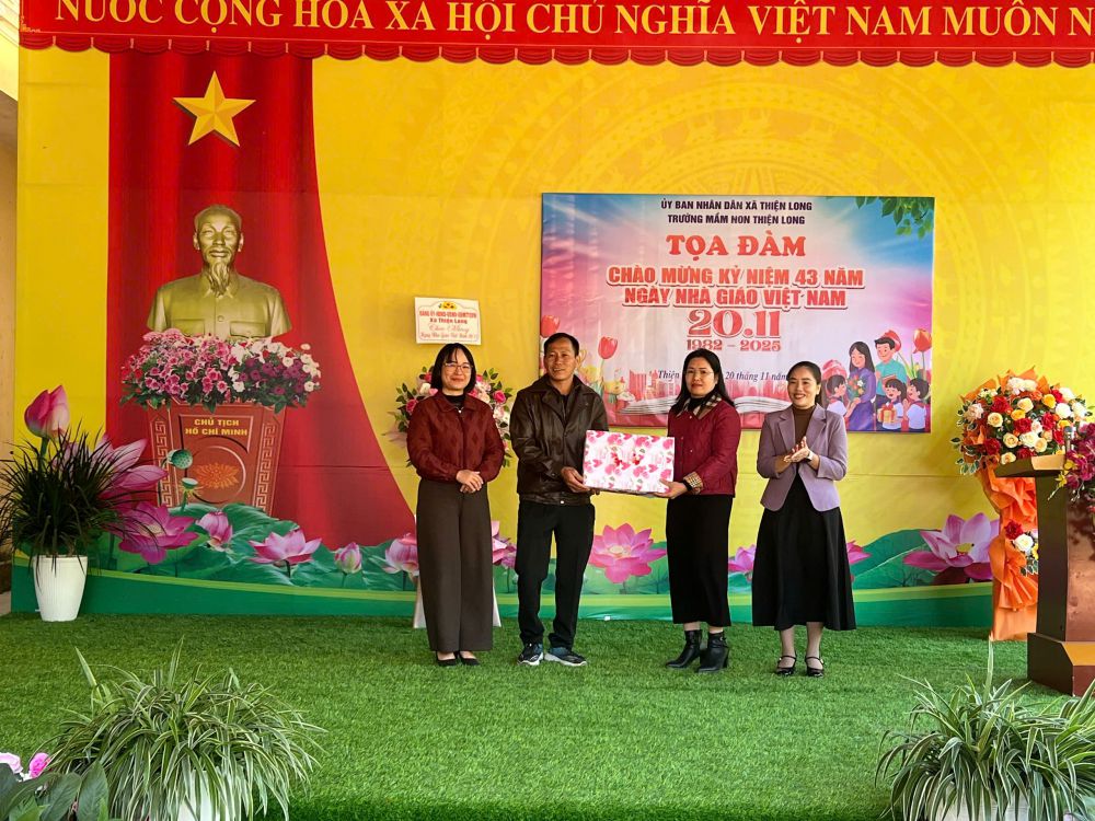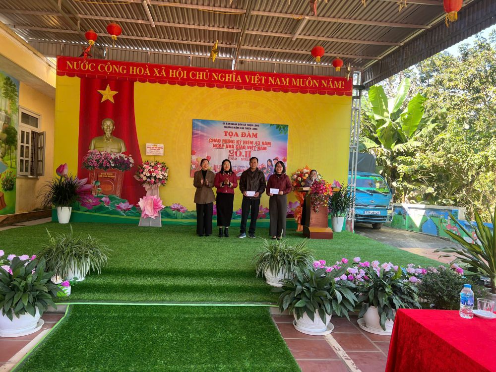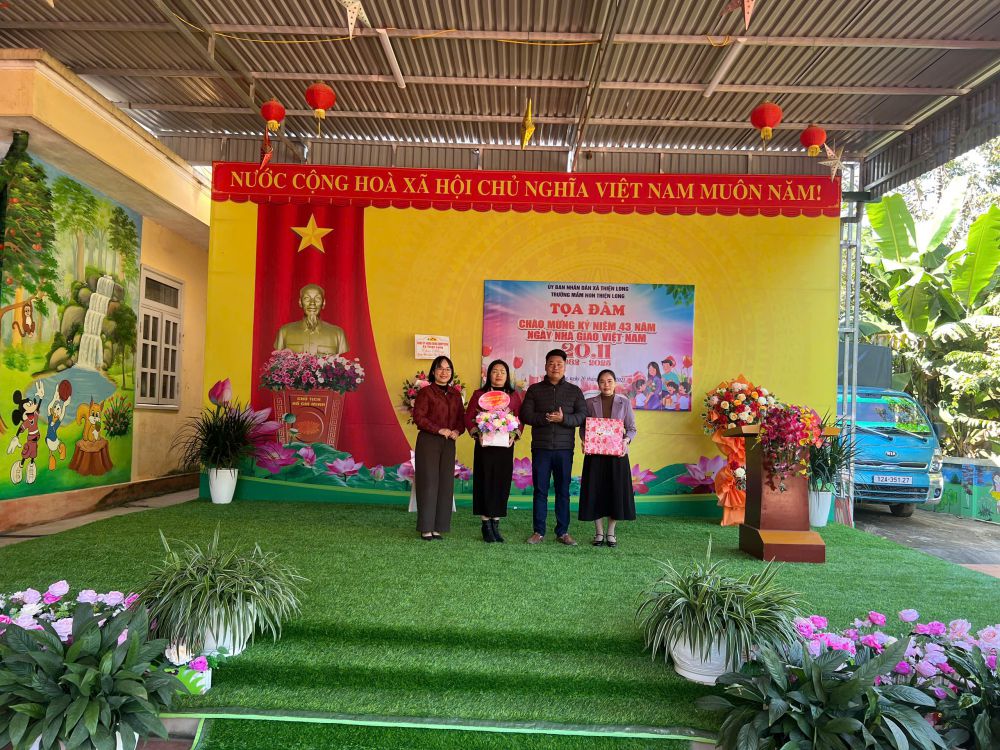 Nhà trường cũng rất vinh được những lời chúc, lời căn dặn và nhận lãng hoa chúc mừng Ngày nhà giáo Việt Nam của Lãnh đạo Đảng Uỷ - HĐND – UBND xã Thiện Long, những món quà chúc mừng đến từ Công an xã, Tập đoàn bưu chính viễn thông Viettel, Hội cha mẹ học sinh, đại diện thôn Khuổi Kiếc, các phụ huynh trong nhà trường.
