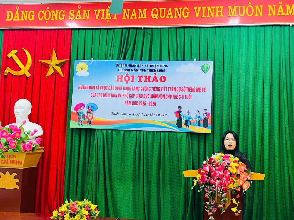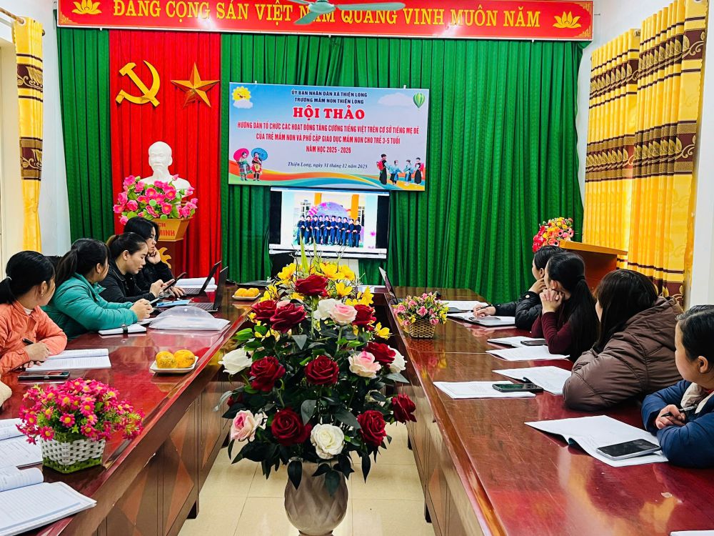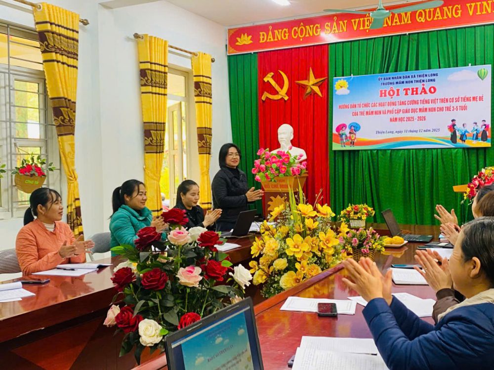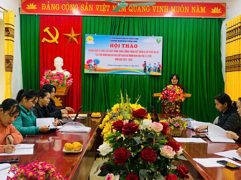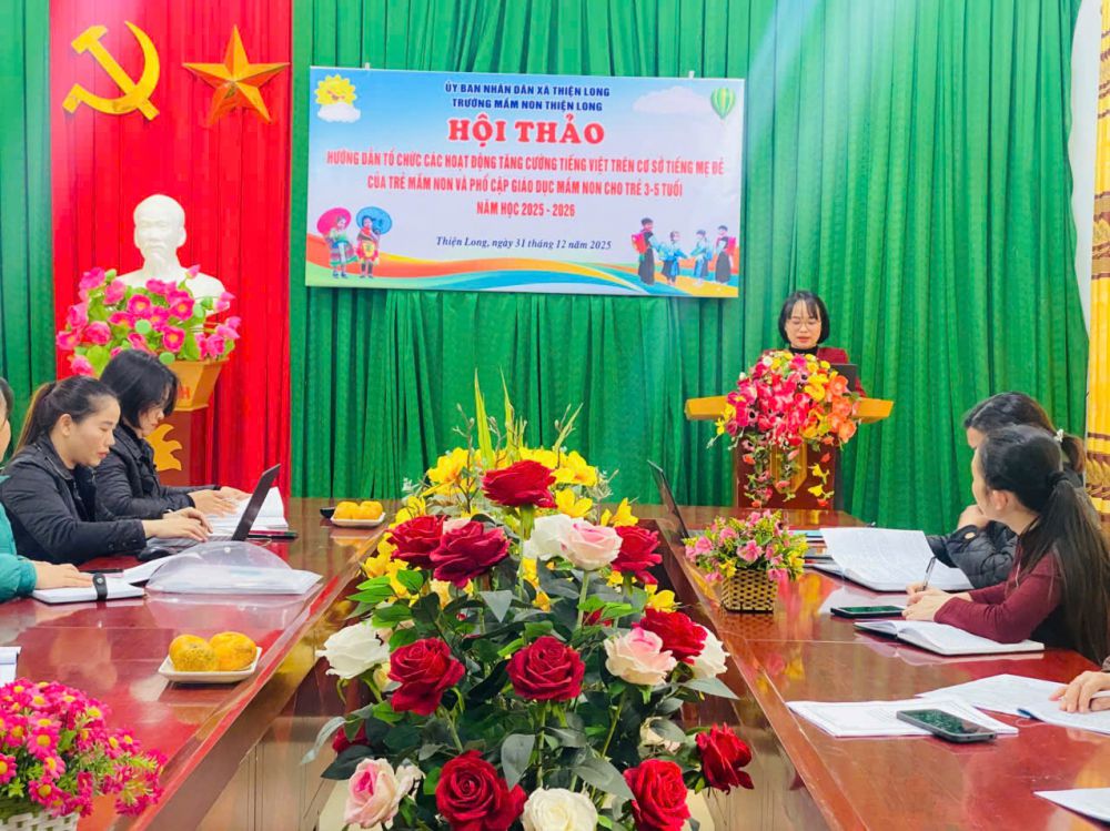 Ngày 31/12/2025, Trường Mầm non Thiện Long đã tổ chức Hội thảo hướng dẫn tổ chức các hoạt động tăng cường tiếng Việt trên cơ sở tiếng mẹ đẻ của trẻ mầm non và phổ cập giáo dục mầm non cho trẻ 3–5 tuổi, năm học 2025–2026.